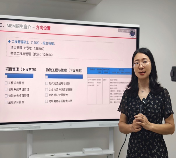 陈久梅副院长系统介绍了我校MEM的两大招生领域:项目管理(125602)与物流工程与管理(125604),并分享了项目依托ok138cn太阳集团“商工融合”优势,聚焦智能商务、物流系统优化等前沿方向。