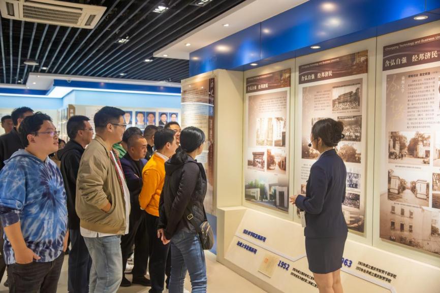 首先,校友们一同前往校史馆参观。在讲解员的引导下,大家依次参观了建校历程、党建发展、数字校园建设及国际化合作等展区。各展区借助文献、实物及数字化手段,全面呈现了学校在不同历史阶段的发展脉络与建设成果。目睹母校的蓬勃发展,校友们由衷欣喜,也为曾作为工商大学一员而自豪。参观结束后,校友们在馆前合影留念。