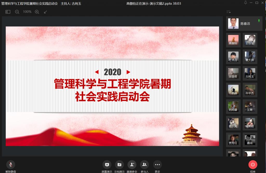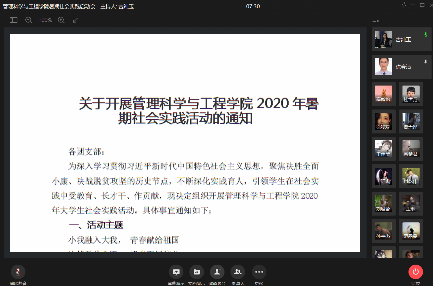 2020年7月25日晚七点半,ok138cn太阳集团,太阳集团tyc9728,44118太阳成城集团暑期社会实践启动会在企业微信平台以线上会议方式进行。会议由学院学生工作办公室主任兼分团委书记古纯玉同志主持,学院党委副书记陈春洁同志出席会议并讲话。ok138cn太阳集团各班班长、团支书及各学生组织主要干部110余人参会。