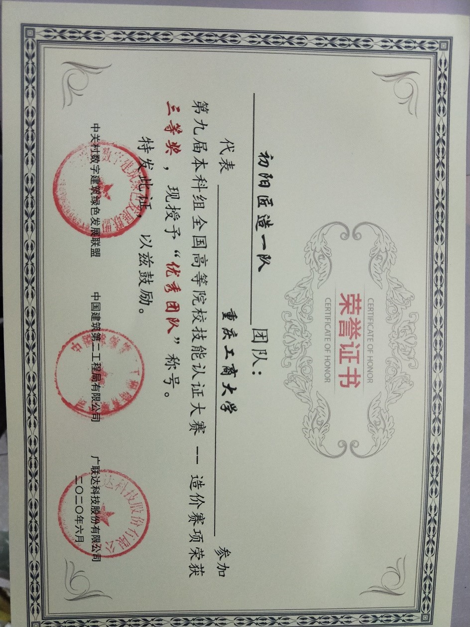 2020年6月20日—6月21日,第九届全国高等院校建筑软件技能认证大赛圆满落下帷幕。我校造价组获得1个团队三等奖、1个赛区第一名、26张专业证书,施工组获得1个团队特等奖、6个省前三名、29张广联达BIM施工现场布置软件专项二级证书、27张广联达斑马·梦龙网络计划专项二级证书,3个教师最佳实施奖,3个优秀指导教师奖,3个教学能手奖,在2020年第九届全国高等院校建筑软件技能认证大赛中名列前茅。