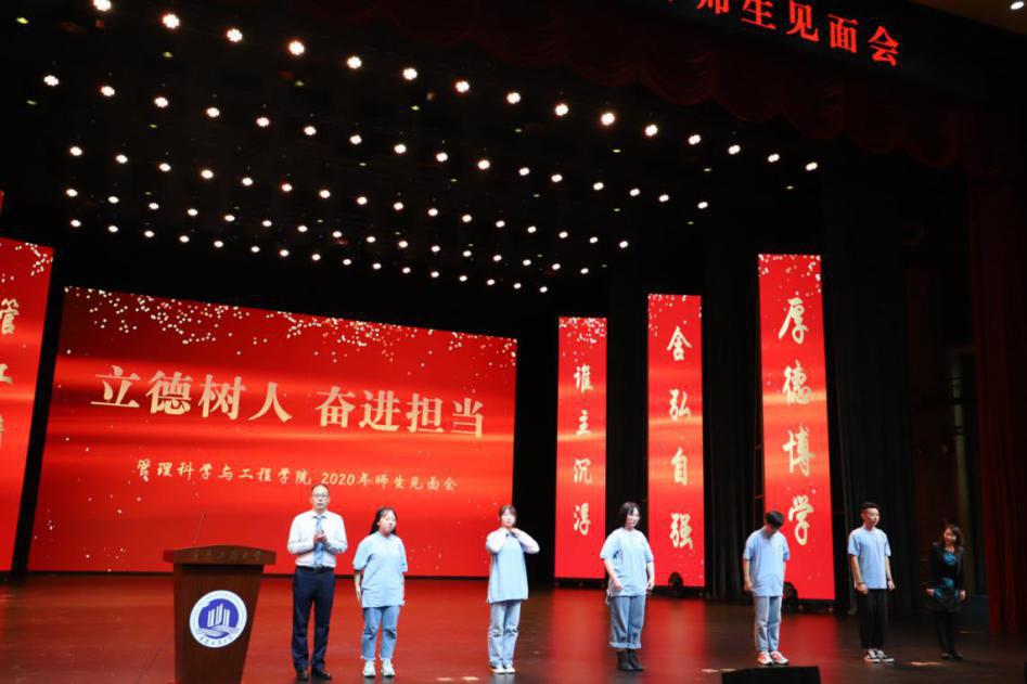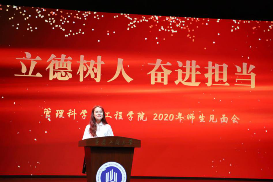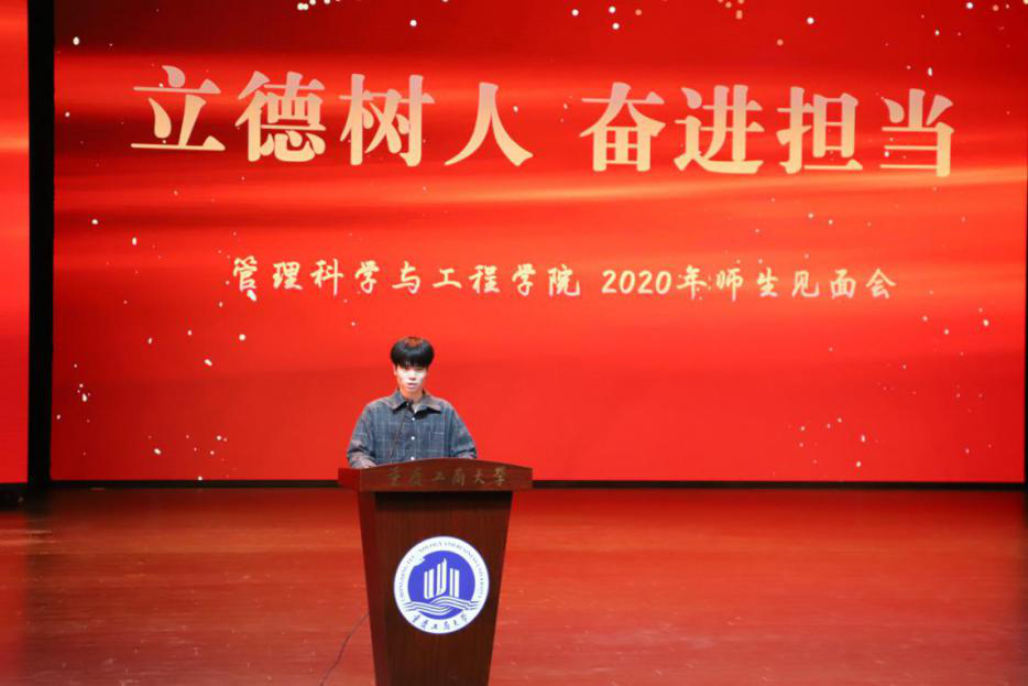 视频结束,研究生代表18级管理科学与工程班吴国奥和本科生代表17级物流三班薛佳慧依次上台发言,他们以学长的身份给学弟学妹们分享自身学习生活经历与经验,希望每一位同学都能够明确学习的目标,一心向学,奋力追逐梦想,不枉此行。信息管理与信息系统系主任唐敏老师作为教师代表上台发言,她寄语同学们“欢迎、传承、创新”,欢迎每一位同学加入全新的管工学院;希望同学们利用学校这个平台,能够传承中华民族智慧,为人生奠定良好基础;还希望同学们在各个领域都能够敢于创新,成就自我。