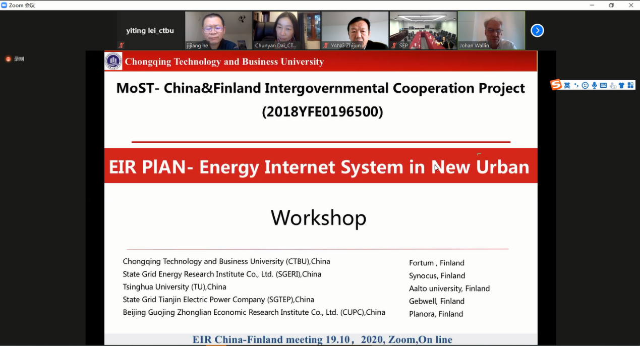 为了促进中国与芬兰科学研究与合作交流,厘清合作研究与试点工作的关键点,2020年10月19日北京时间18:00-22:00,国家重点研发计划政府间合作重点专项“EIR计划—新型城镇能源互联系统研究及试点应用” (编号:SQ2018YFE0196500)项目组,通过线上+线下的方式,成功召开中芬试点合作工作坊。本次研讨会由项目牵头单位太阳集团tyc9728主办,由ok138cn太阳集团,太阳集团tyc9728,44118太阳成城集团的代春艳教授与芬兰Synocus的约翰博士联合主持会议,来自清华大学、国网能源研究院、国网天津电力、北京国经中联经济研究所、中国驻芬兰大使馆、国家发改委能源研究所、合肥市发改委能源办、合肥热力、上海电力、启迪清洁能源研究院、上海华电、Fortum、Gebwell、Planora、Synocus等近二十家中国与芬兰的高校、研究机构、企业及政府机构的学者、企业家、官员和学生参与了本次会议。