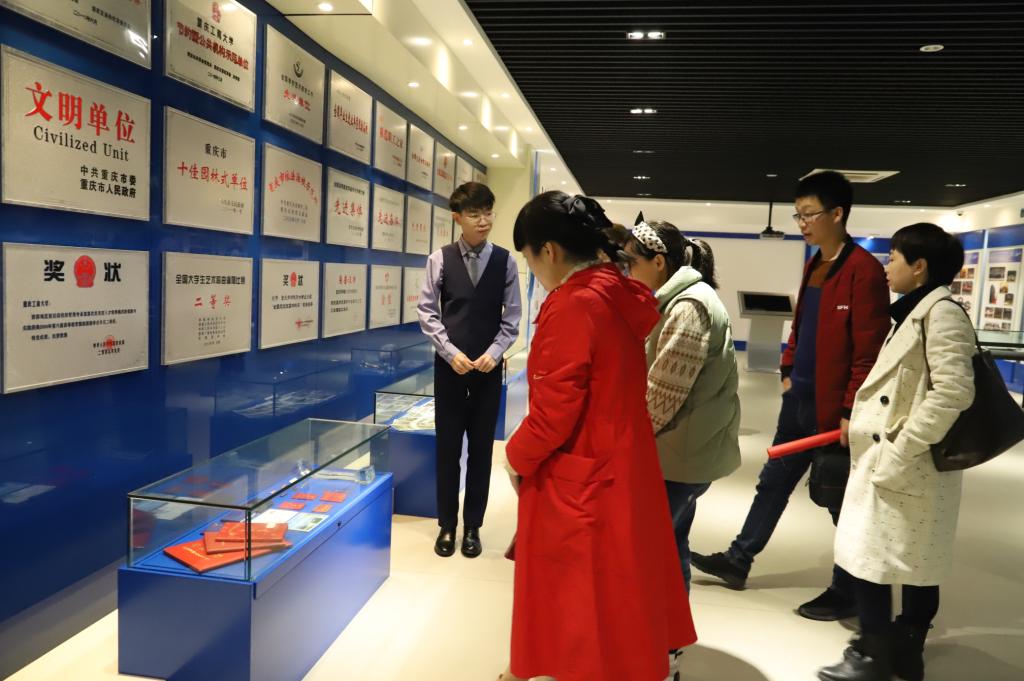 接下来,在协会志愿者和校友会志愿者的带领下,师生们一同前往学校校史馆进行参观。在校史馆内,馆内志愿者带领校友们观看了学校的沙盘模型,向校友们介绍了学校十年来的规模变化、重要事件以及发展情况。校友们目睹了学校的发展和成长,欣喜之情溢于言表,也为自己曾经是工商大学的一分子而感到自豪。