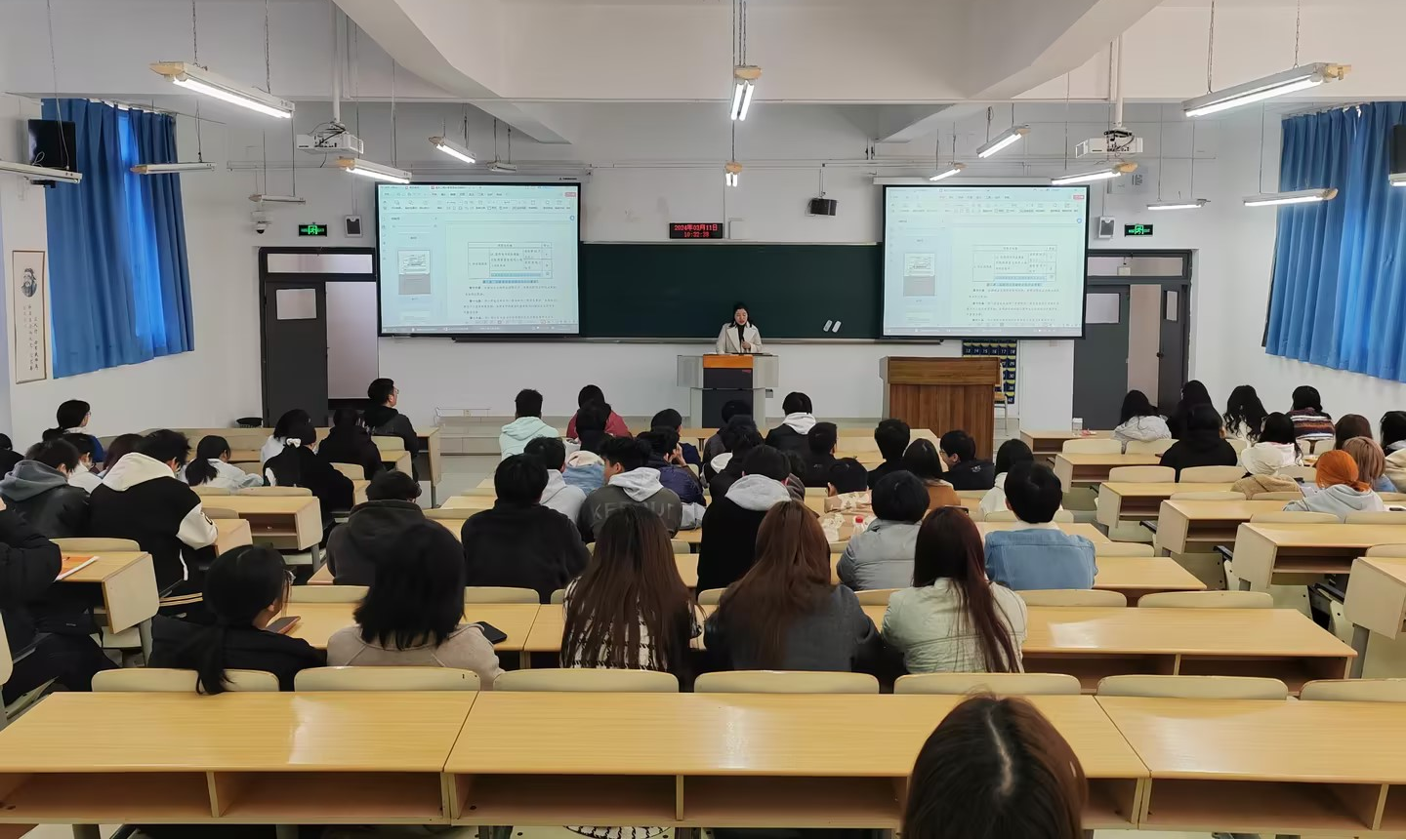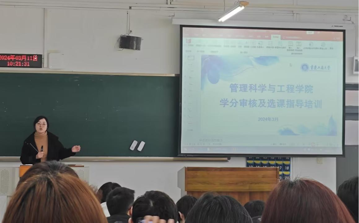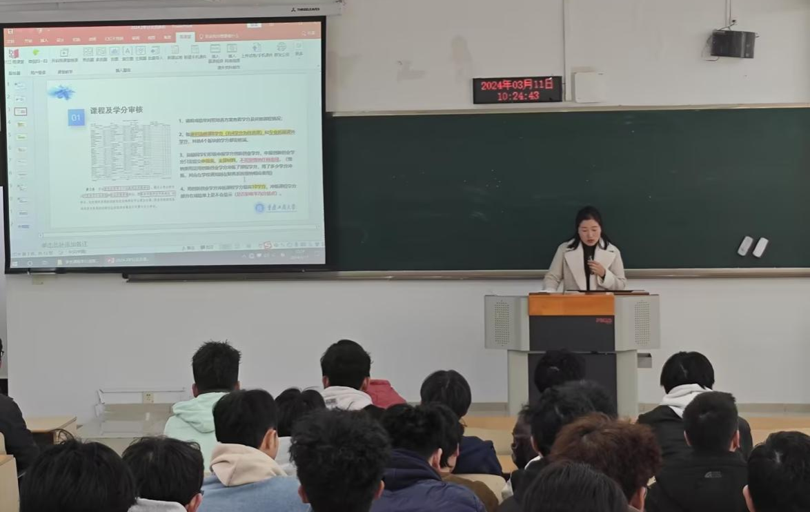 随后,教务办胡恋老师从课程及学分审核、选课注意事项和课程认定三个方面进行了详细讲解。在申报创新创业学分方面,胡恋老师鼓励大家积极申报,并指出了申报学分时的一些注意事项。在选课方面,胡恋老师从通识选修课、英语提高课、专业拓展课以及退选课等方面进行了详细解答。最后,胡恋老师特别强调课程专业认定工作的重要性。通过胡恋老师的讲解,同学们对学分认定等各项工作有了更加清晰的认识。