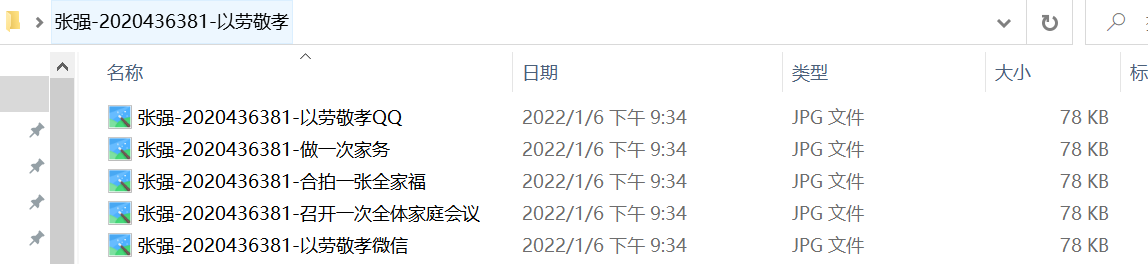 各支部参与活动的同学向团支书上交截图与活动图片时,将截图命名为“姓名-学号-以劳敬孝QQ/微信/活动名称”,并将两张截图放置在同一文件夹(文件夹名称:姓名-学号-以劳敬孝)内发至团支书处。示意图如下: