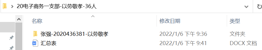 团支书将各支部文件收齐后统一命名为“支部名称-以劳敬孝-上交人数”,如“20电子商务一支部-以劳敬孝-36人”,和汇总表一齐发送至指定邮箱。示意图如下: